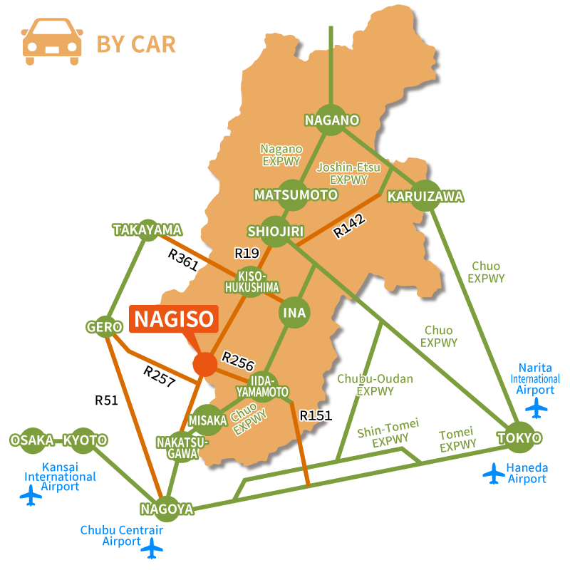 | By Car | Nagoya highway interchange → (Tomei Expressway) → Komaki junction → (Chuo Expressway) → Nakatsugawa highway interchange → (Japan National Route 19) → Nagiso Time Required: around 1 hour and 30 minutes |