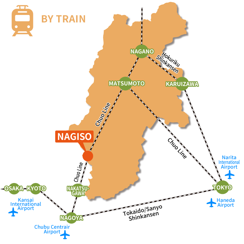 | By Train | Nagoya Station → (Limited Express Shinano) → Nagiso Station Time Required: around 1 hour |